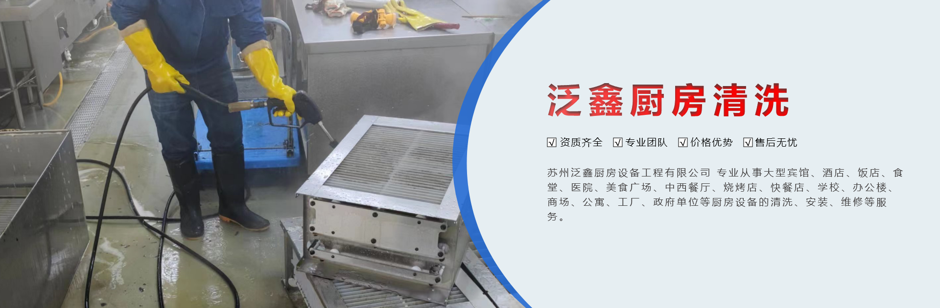 苏州泛鑫厨房设备工程有限公司专业从事大型宾馆、酒店、饭店、食堂、医院、美食广场、中西餐厅、烧烤店、快餐店、学校、办公楼、商场、公寓、工厂、政府单位等厨房设备的清洗、安装、维修等服务。对于高压清洗大型油烟机,对酒店、餐厅的大型油烟机清洗有成熟的经验,采用高压水射流清洗机清除污垢,充分诠释“低碳,环保”的理念。根据现场为客户量身制定高效,安全的清洗方案。